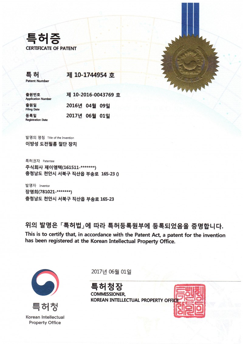 특허 제10호-1744954호 이방성도전필름 절단장치 본문 목록 이전글특허 제10호-1908741호 골프채 자동 조립시스템 19.01.18 다음글ISO14001 인증서 19.01.18