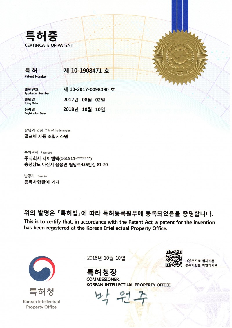 특허 제10호-1908741호 골프채 자동 조립시스템 본문 목록 이전글2019년 3년 연속 NICE평가정보 기술평가 우수기업 선정 19.05.22 다음글특허 제10호-1744954호 이방성도전필름 절단장치 19.01.18