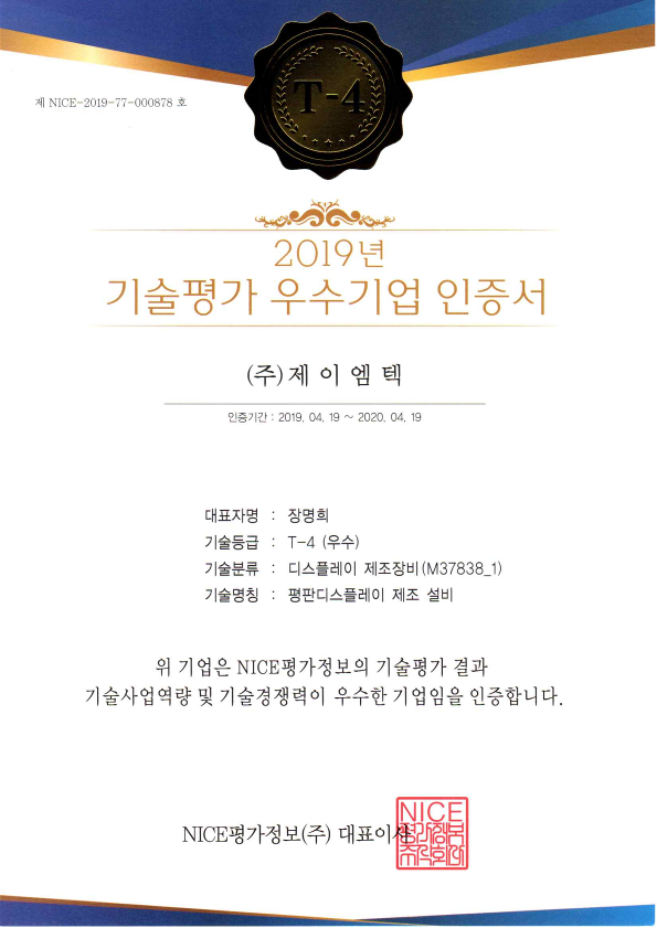2019년 3년 연속 NICE평가정보 기술평가 우수기업 선정 본문 목록 이전글이차전지제조용 제조장비[히팅롤러]특허증 제10-1992280호 19.06.28 다음글특허 제10호-1908741호 골프채 자동 조립시스템 19.01.18