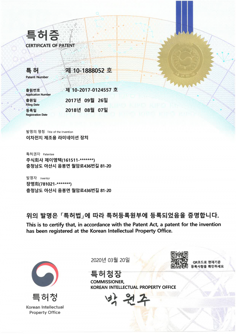 특허 제10-1888052호 이차전지 제조용 라미네이션 장치 본문 목록 이전글ISO 9001 인증서 24.02.28 다음글이차전지제조용 제조장비[히팅롤러]특허증 제10-1992280호 19.06.28